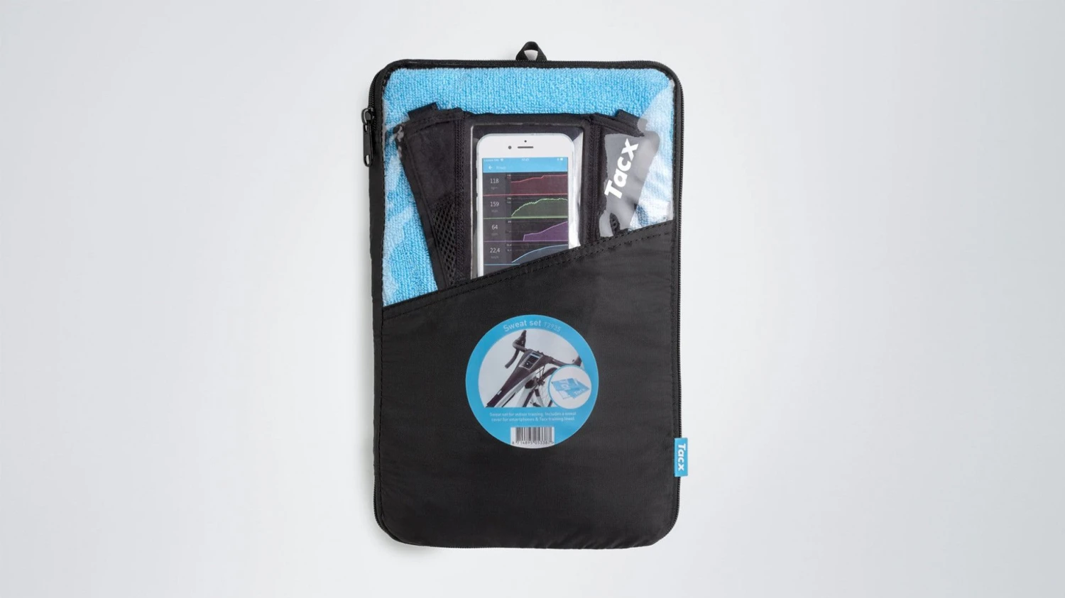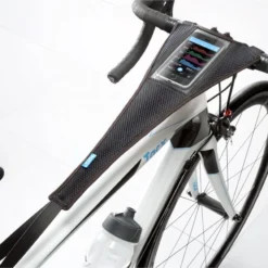 Tacx’s anti-perspiration fabric with smartphone pocket protects your v lo and your smartphone against perspiration and allows you to keep an eye on your performance during training. Absorbent and easy to assemble, it adapts all types of v los.