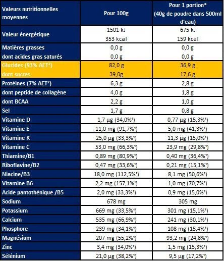 Ingredients : Maltodextrin *, sugar *, dextrose *, minerals (sodium citrate, potassium citrate, calcium phosphate, magnesium citrate, zinc sulfate, sodium selenate), hydrolyzed collagen peptide, fructose, branched chain amino acids branched (L-leucine, L-isoleucine, L-valine, emulsifier: sunflower lecithin), natural lemon flavor, acidity regulator: citric acid, vitamins (C, B3, E, B6, B5, B1, D3, K1, B2). * ingredients from France.