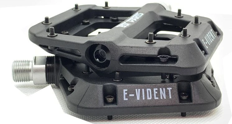 With the pair of E-Vident pedals, access a technical and durable product offering the best quality / price ratio. Perfect for all MTB, E-Bike, All Mountain / Enduro, DH, Freeride, and Dirt Jump / Pumptrack practices, they are based around a strong and robust nylon composite body and a large platform offering a excellent adhesion with its 8 steel pins per side, removable.