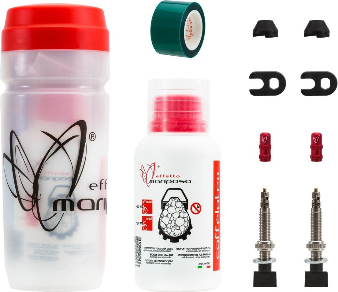 To take full advantage of Caffélatex sealant, we created complete kits, to convert standard bicycle wheels into tubeless. Intended for Tubeless and Tubeless-Ready mountain bike and road tyres.