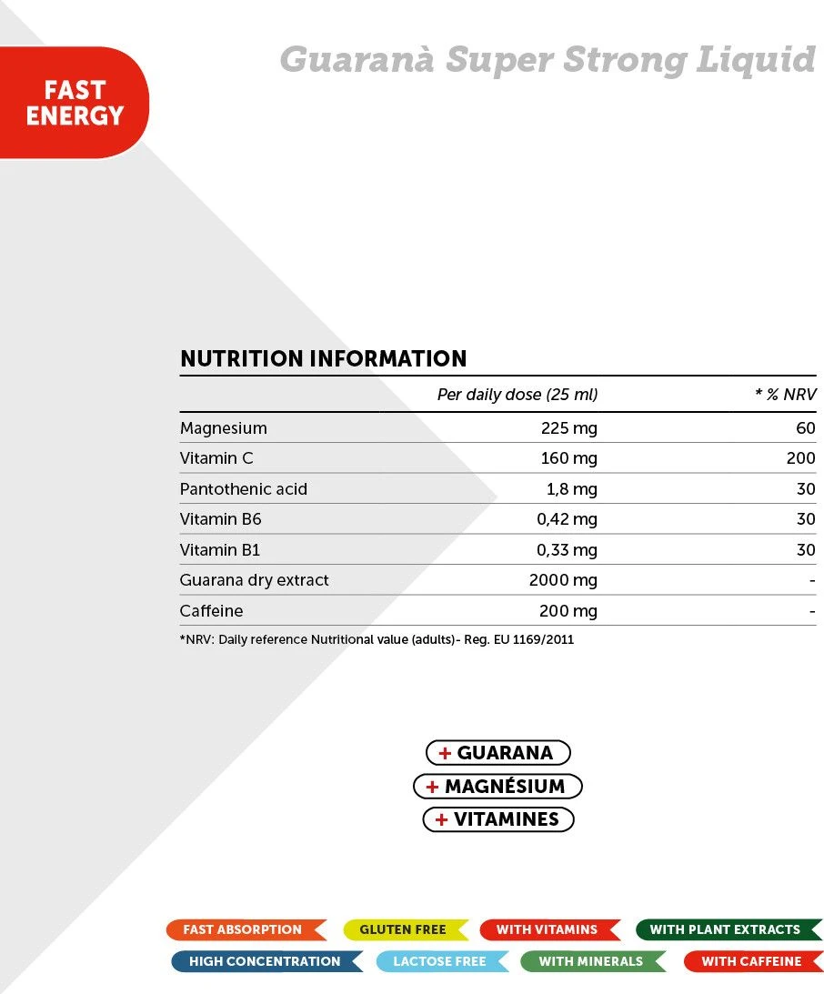 The Guarana Super Strong NamedSport shot has? energizing action, a? base of guarana, magnesium and vitamins is particularly useful in the practice of endurance sports. Guarana has a toning and energizing effect; magnesium promotes normal muscle function, protein synthesis and, combined? at? vitamin B6, helps? counter fatigue and asthenia. Vitamin C helps? protect cells against oxidative stress and pantothenic acid promotes mental performance.