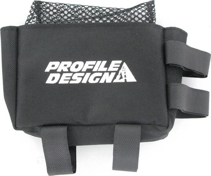 Bicycle frame top-tube mounted storage pack mounts behind the stem. Nylon construction with mesh flap cover. Padded sides help maintain shape no matter the contents.