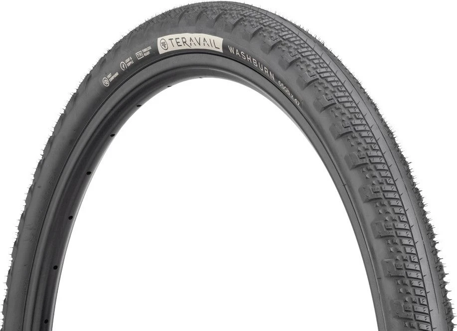 The Teravail Washburn is our fastest-rolling gravel tire, built for race-day efforts on hard-packed gravel and backroads but practical enough for your daily commute and rides around town. The center slick minimizes rolling resistance for greater speed and momentum, while the transition knobs and raised side lugs are spaced out to provide cornering traction and shed debris. The 650b x 47 mm size offers increased volume for a larger contact patch and more grip.