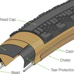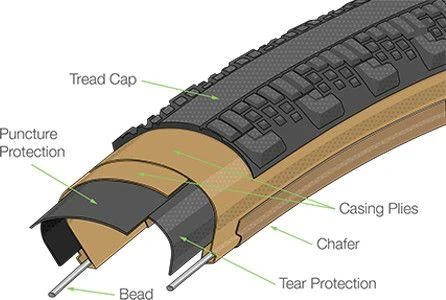 Durable Bead-to-Bead: This construction consists of a robust woven nylon composite reinforcement between the outer rubber and the inner casing within the tire’s sidewalls to prevent tearing and abrasions. Additionally, a tightly woven layer of protection under the treadcap defends against punctures.
