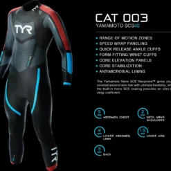 Designed for competition at every level, the Men’s Hurricane Wetsuit Cat 3 utilizes some of the best features from our Cat 5 Hurricane to optimize speed and help you outperform the pack on race day. First up? The triathlon world’s most premier wetsuit fabrication: Yamamoto neoprene. Specifically employed for triathletes that are elite level swimmers, Yamamoto is used to drastically reduce restriction on the body, creating the feeling of a second skin. Through a combination of comfort and uninhibited movability, Yamamoto optimizes both speed and control in the water. At TYR Sport we believe that having the best wetsuit begins with having the best fabrication. As a result, every Cat 3 Hurricane is constructed with 100% 40 Cell Yamamoto neoprene. In addition, the process of Super Composite Skin (SCS) Nano Coating is used alongside the fabrication to enhance comfort and freedom of movement. With both hydrophobic and hydrophilic properties, SCS repels water, ensures high heat retention for decreased body fatigue and boasts incredible durability to prevent abrasions and increase product life. Rather than a standard seam construction, each Cat 3 also utilizes speed wrap paneling to comfortably hug and hold you in. Next, strategically placed elevation panels are employed to establish proper body positioning relative to the water’s surface, while graded catch panels on the forearms of the suit provide a catch-and-pull stroke similar to having a built-in paddle. When working in conjunction with form-fitting wrist cuffs, the result is maximized power strokes without any water intake. Each and every HCAHM6A wetsuit also includes quick release ankle cuffs, an innovative antimicrobial lining and state-of-the-art range of motion zones. All TYR Hurricane wetsuits are WTC (Ironman) / USAT legal and provide UPF 50+ sun protection