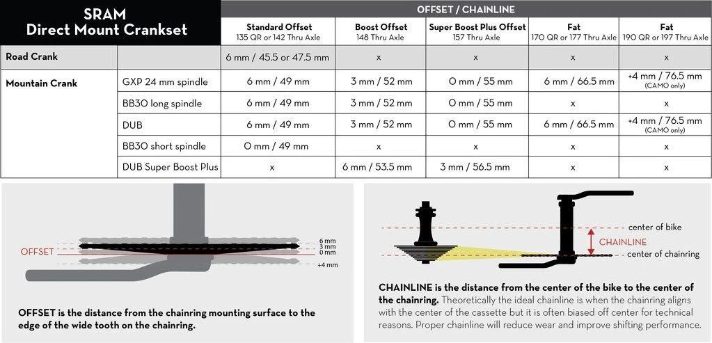 - Standard MTB: 6mm offset for non-Boost mountain bikes, GXP and long spindle BB30 cranks for 49mm chainline.