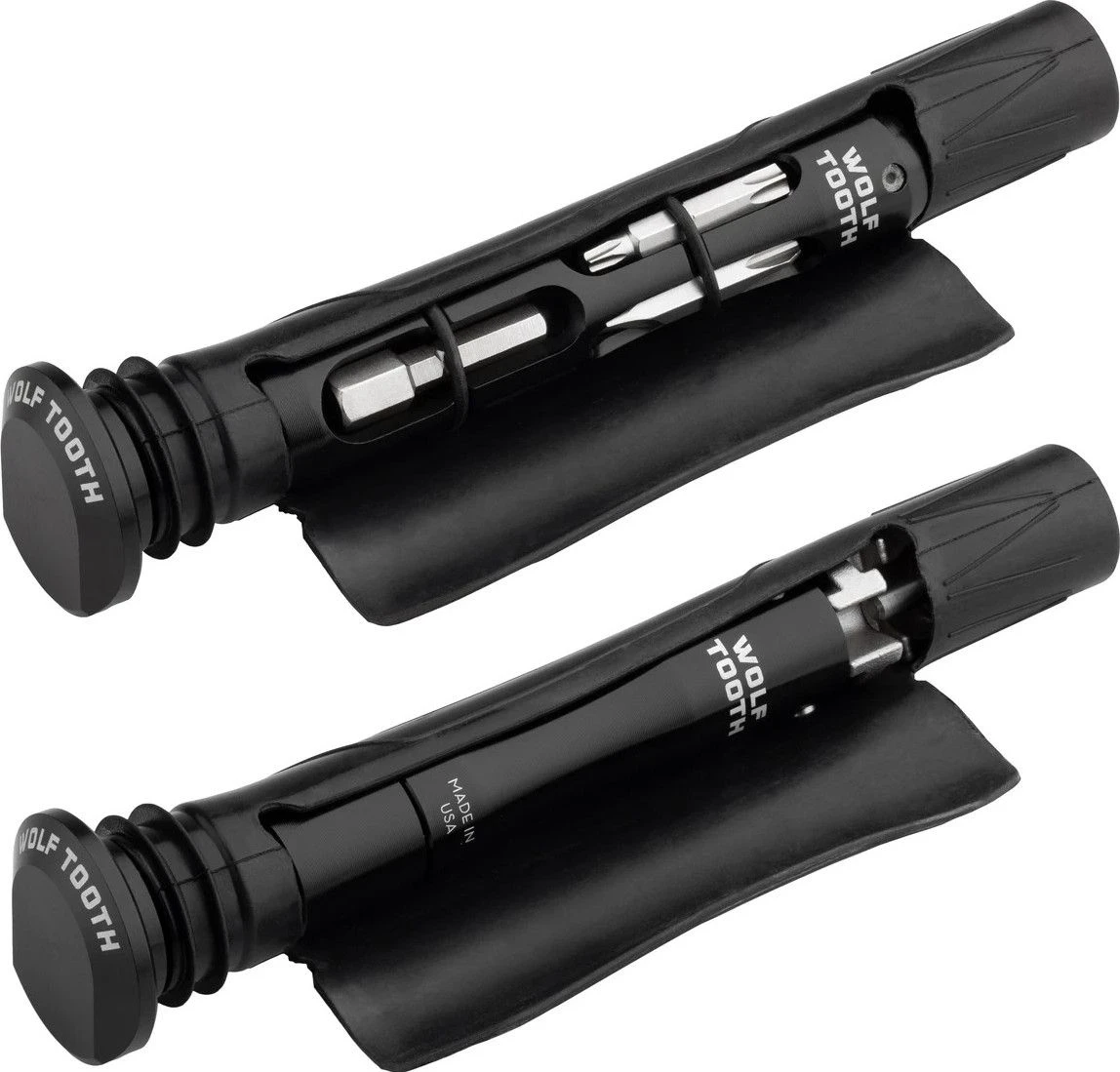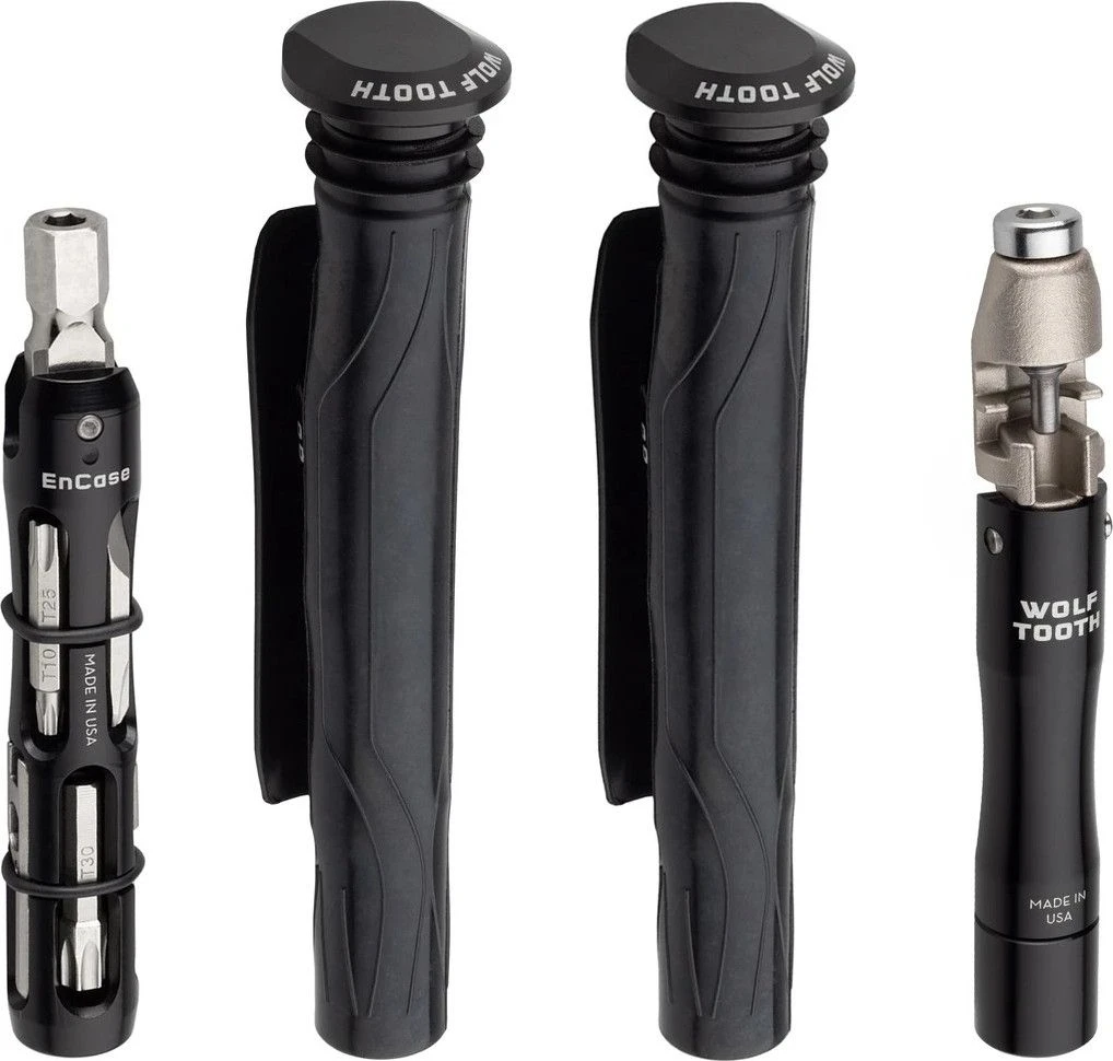 In-bike storage and essential riding tools that can meet the needs of almost any trailside repair. Durable, flexible storage sleeves make for a secure, clean place to stow EnCase System tools or other small items. Fits most mountain bars and most road bars thanks to a storage sleeve with a customizable rubber flap that can be cut to meet your handlebars inner diameter. The Wolf Tooth EnCase System Bar Kit One: Bar Kit One includes a Hex Bit Wrench Multi-tool, a Chain + Tire Plug Multi-tool, and two Storage Sleeves.
