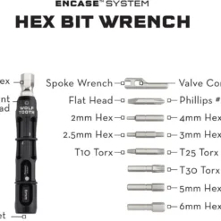 - 14 functions (spoke wrench for 0.127″ (3.23mm) nipples; valve core wrench; flat head #3.5; Phillips #2; 2mm, 2.5mm, 3mm, 4mm, 5mm, 6mm, and 8mm hex; and T10, T25, and T30 Torx compatible).