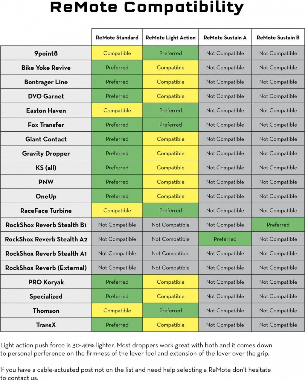 - Broad compatibility: The ReMote has been tested and is recommended for use with many cable-actuated dropper posts. See the compatibility section below for details.